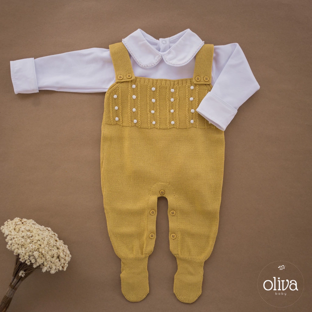 A jardineira é mostarda com detalhes bordados no poá. Super unissex! Que tal escolher um body para dar um charme a mais?!